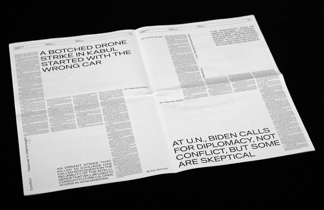 To begin this project, we had to choose a typeface from a given selection. Each student chose a different typeface, and the aim was to create a consistent layout system based on the number of articles and their length. The content was already provided, so we only had to work on the layout. For my part, I chose Antarctica Beta Expanded. Wide fonts are not the most legible and can be quite challenging to work with in layout design. To establish hierarchy among the elements, I left plenty of white space to make the layout more breathable; text sizes and their orientation complemented and supported the overall composition. First-line indents were also added to improve readability. I had to follow several micro-typography rules to maintain coherence throughout the entire layout.